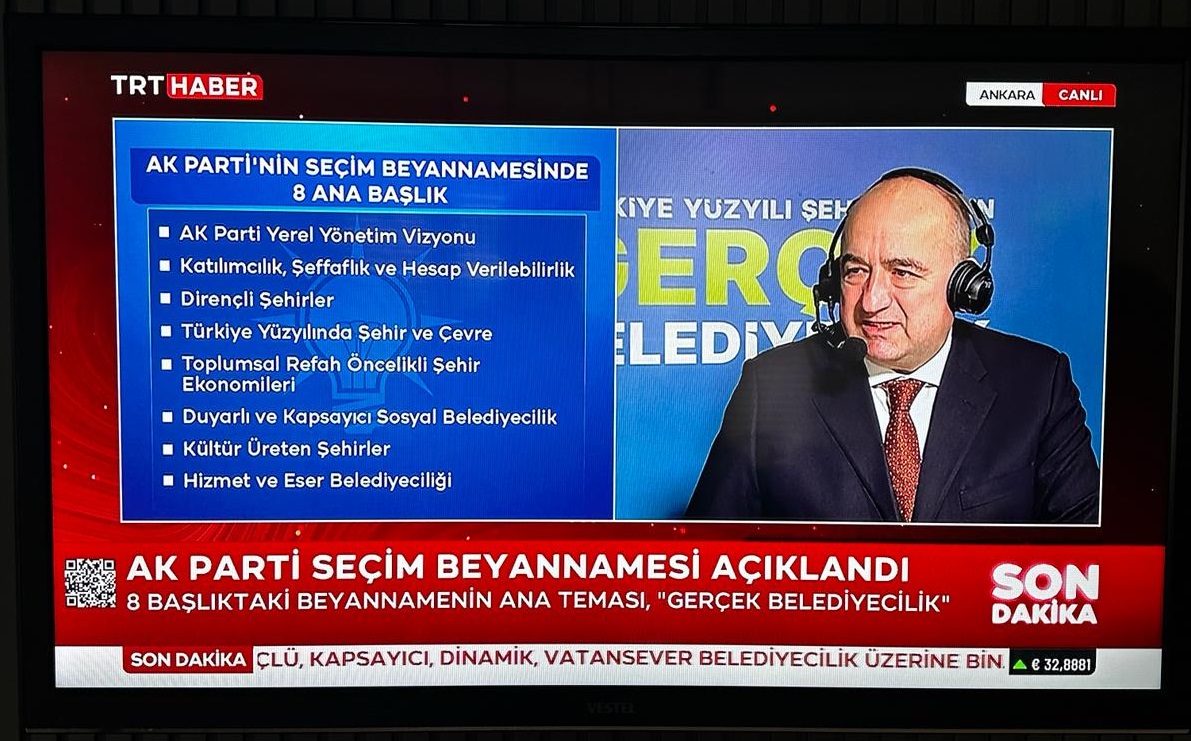 AK Parti Çanakkale Milletvekili Ayhan Gider, TRT Haber canlı yayınında Cumhurbaşkanı Recep Tayyip Erdoğan tarafından Ankara’da düzenlenen “Türkiye Yüzyılı Şehirleri İçin Gerçek Belediyecilik” adlı programda açıklanan “AK Parti Seçim Beyannamesi”ne ilişkin değerlendirmede bulundu.